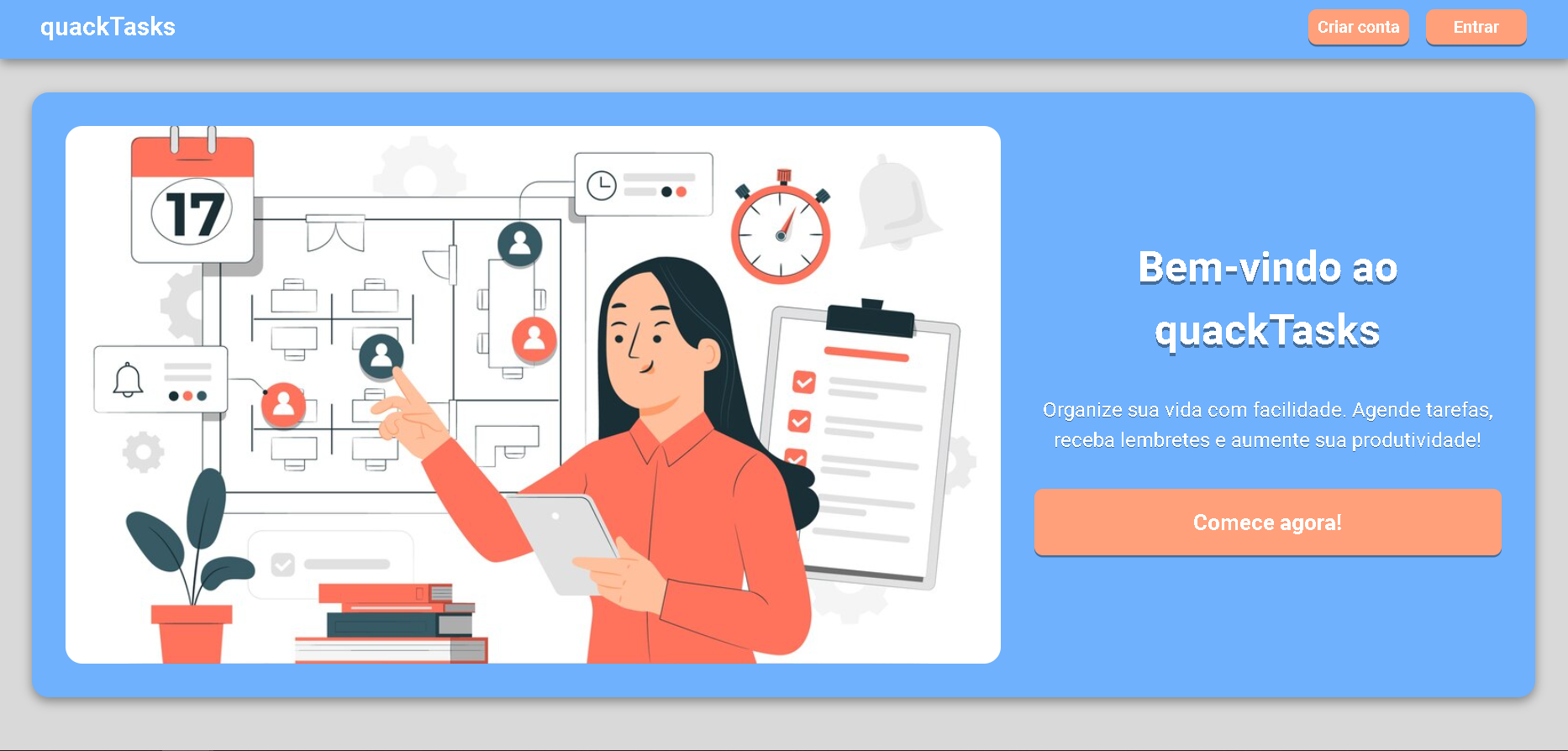 Tive a ideia de proporcionar uma experiência simplificada e intuitiva no gerenciamento de tarefas, permitindo que você se organize de forma mais eficiente. Utilizando meus conhecimentos em desenvolvimento web. Com o quackTasks, você pode: Criar tarefas e atribuir prazos e prioridades para manter-se organizado. Receber notificações via e-mail para estar sempre atualizado sobre o progresso das suas tarefas.